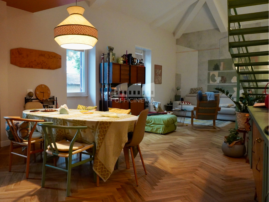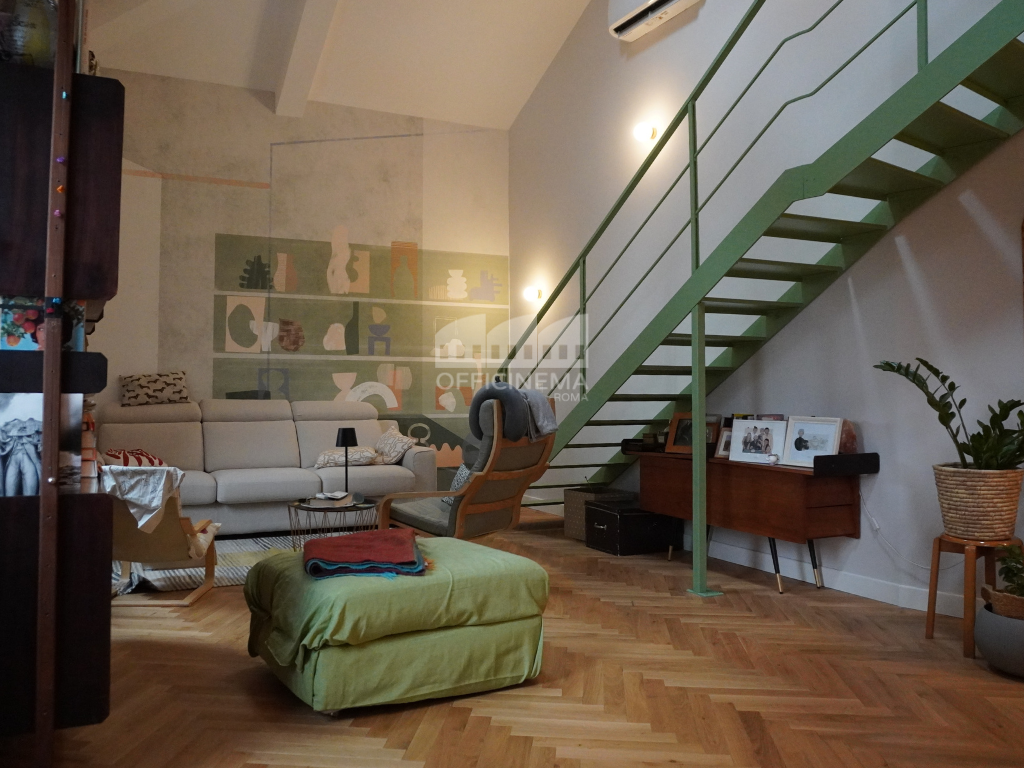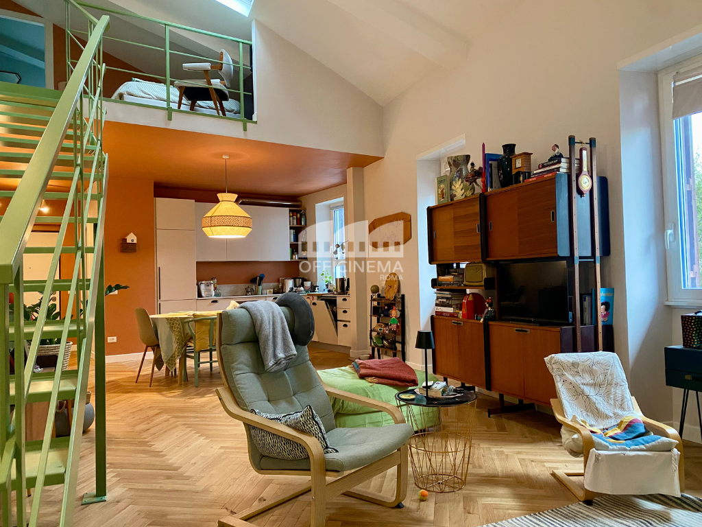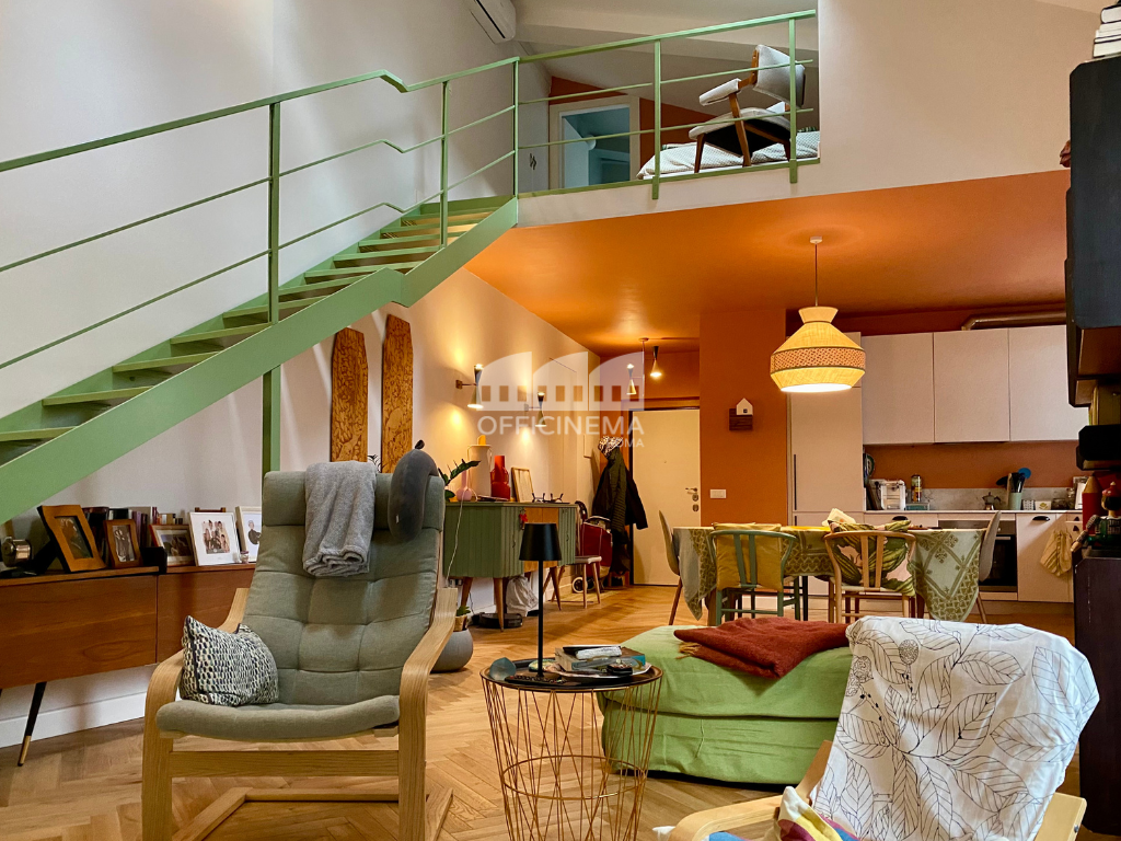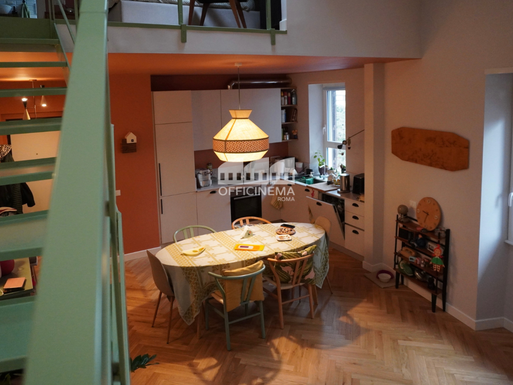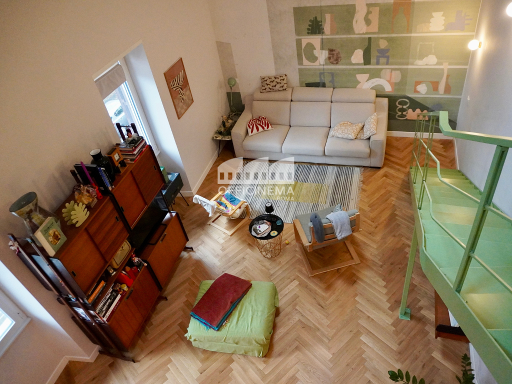 Loft moderno situato in un piccolo edificio, caratterizzato da una palette di colori pastello. La scala verde, la cucina a vista, la raffinata carta da parati, il parquet chiaro, valorizzano la zona giorno, creando un ambiente luminoso e raffinato. Ideale per piccole e agili troupe, perfetto come location per spot pubblicitari.