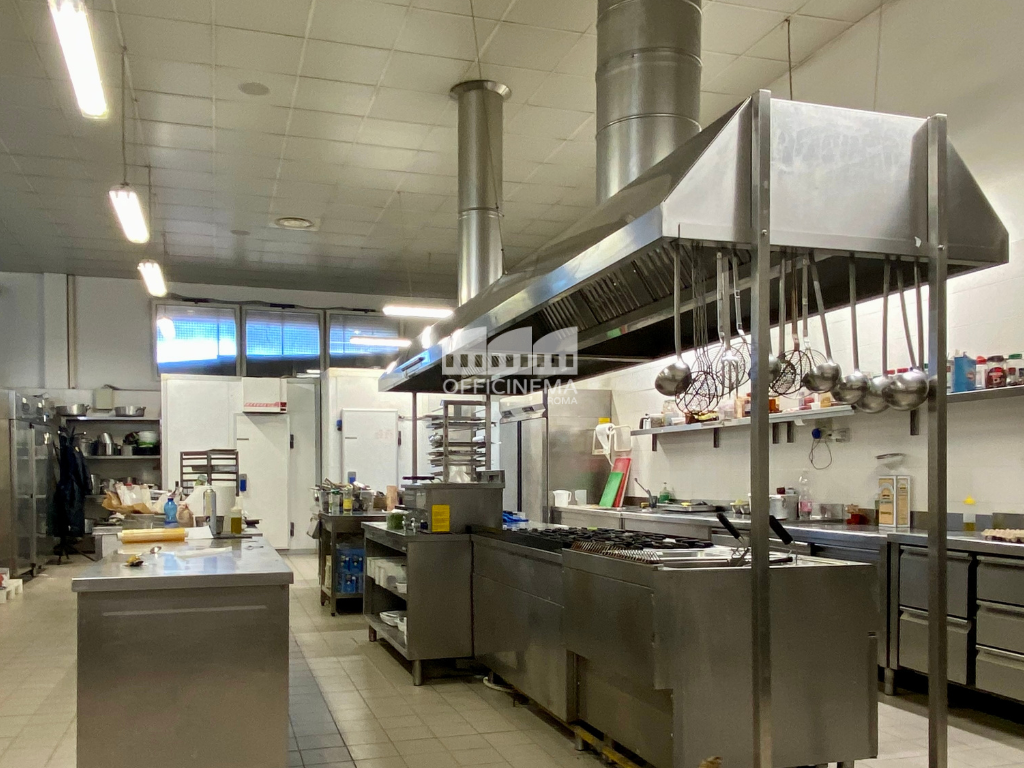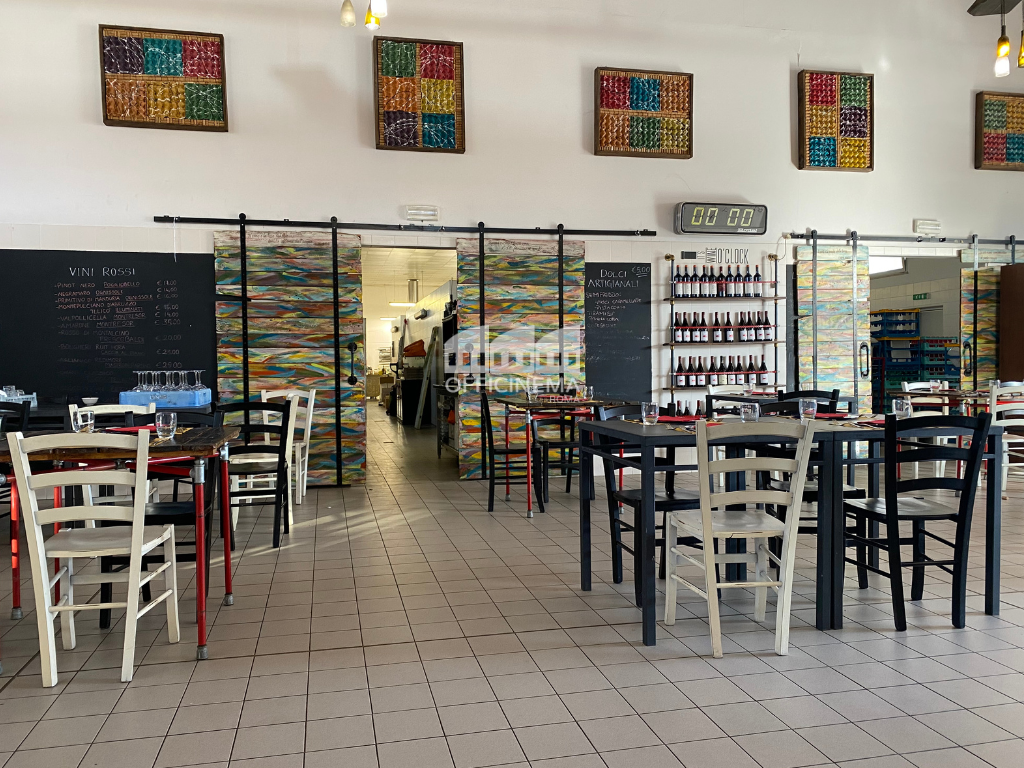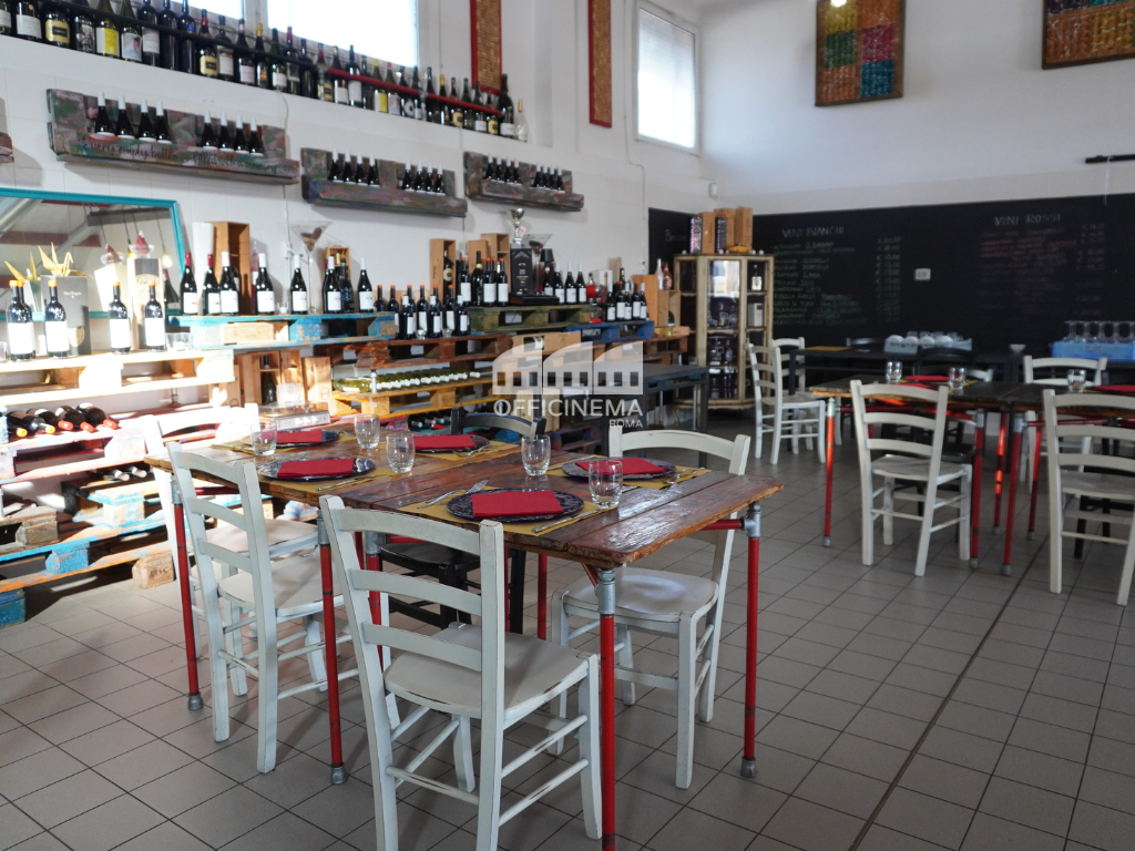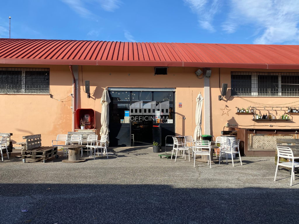 Spazio industriale composto da un’osteria luminosa, semplice nel suo genere e da una grande cucina industriale suddivisa in più ambienti. L'area esterna è arredata con tavolini, ombrelloni chiari ed il bancone bar. Un parcheggio e le strade vicino sono adatte ai mezzi di produzione.
