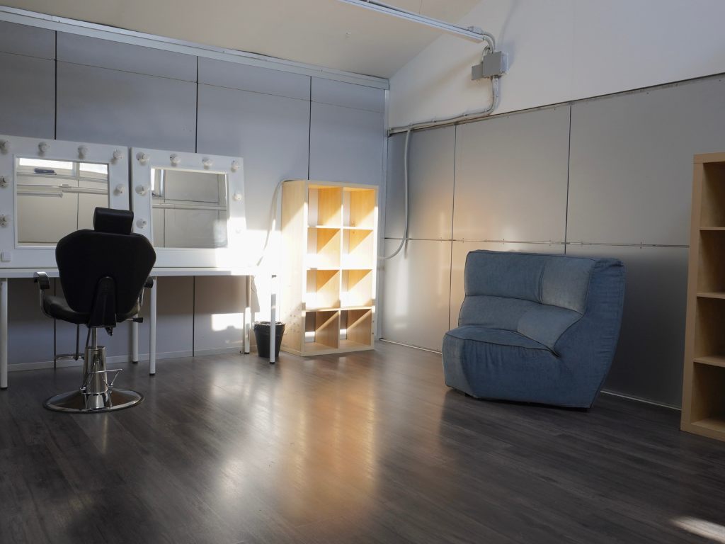 Sala trucco con lavabo per lavaggio capelli ubicata al primo piano degli uffici sud, sopra le sartorie S, con 4 postazioni e lavandino.