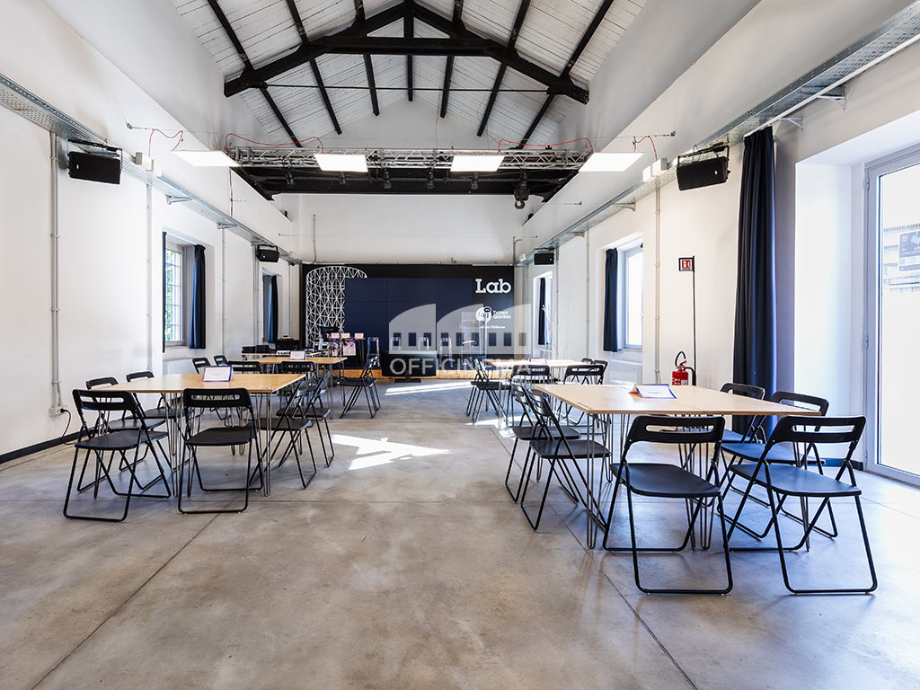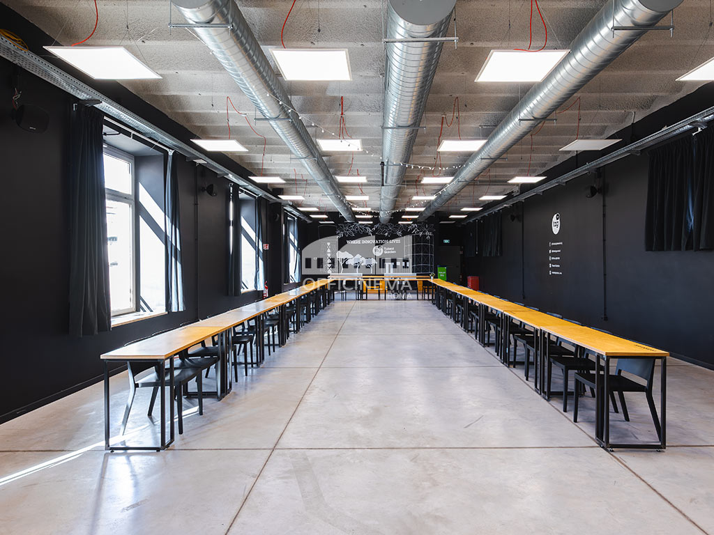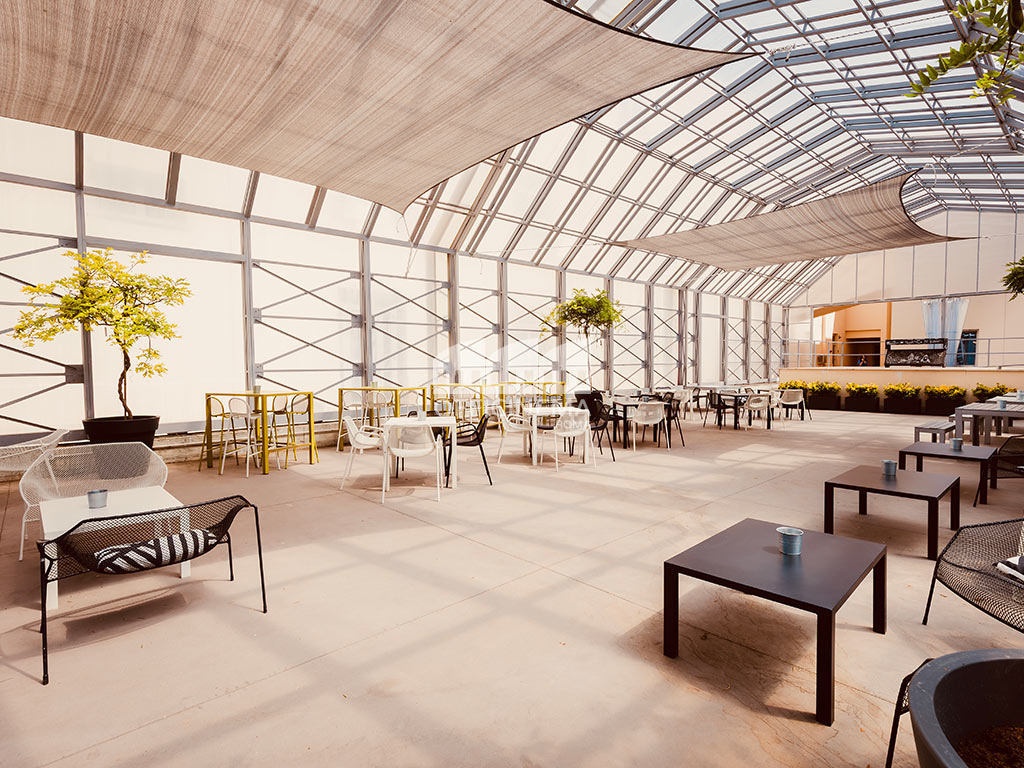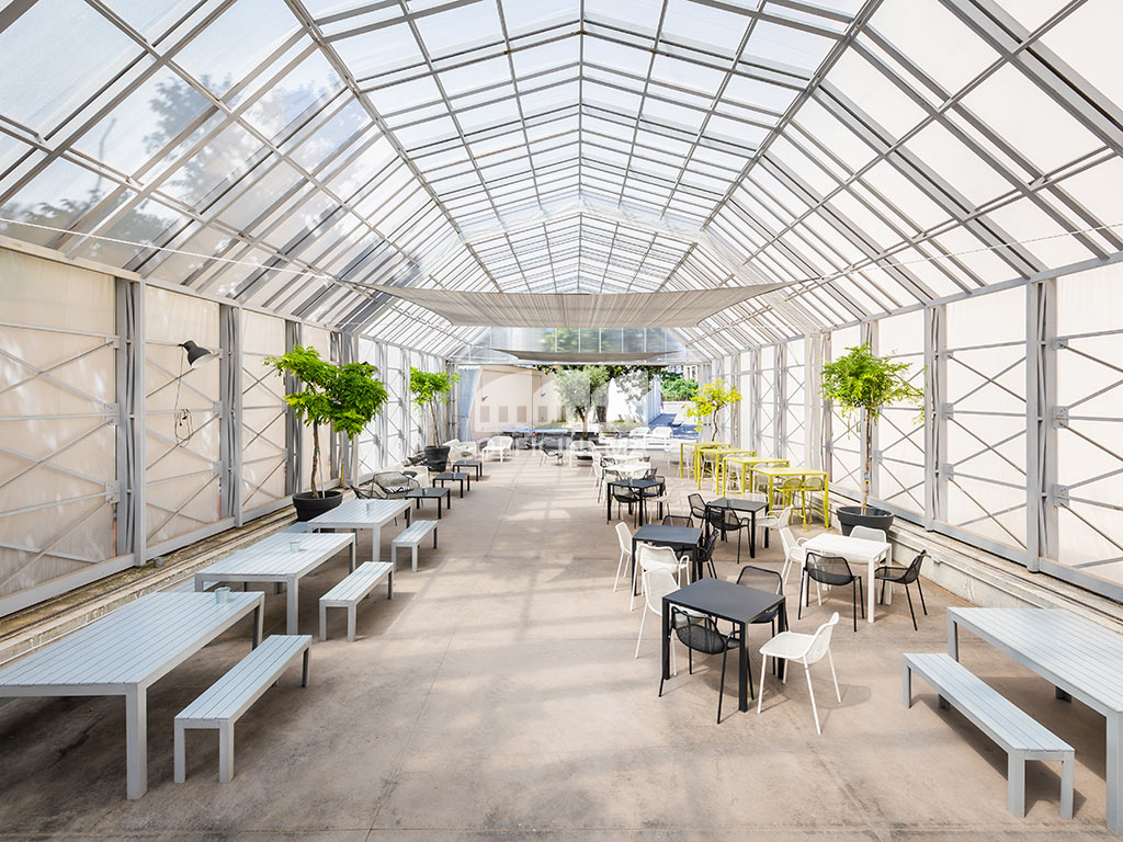 Spazio polifunzionale costituito da ampi luoghi deputati: dalla tensostruttura che ricorda un giardino d’inverno, al Lab con ingresso indipendente incorniciato da edifici industriali romani, alla sala conferenze dotata di palco e schermo per le proiezioni.